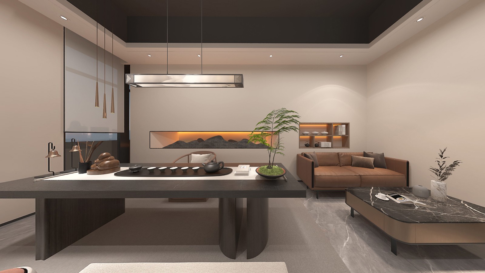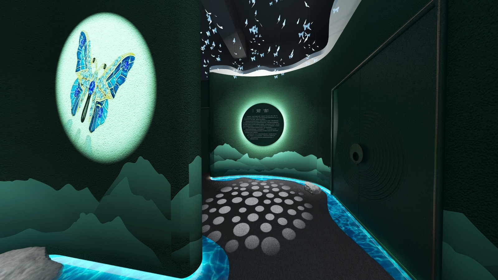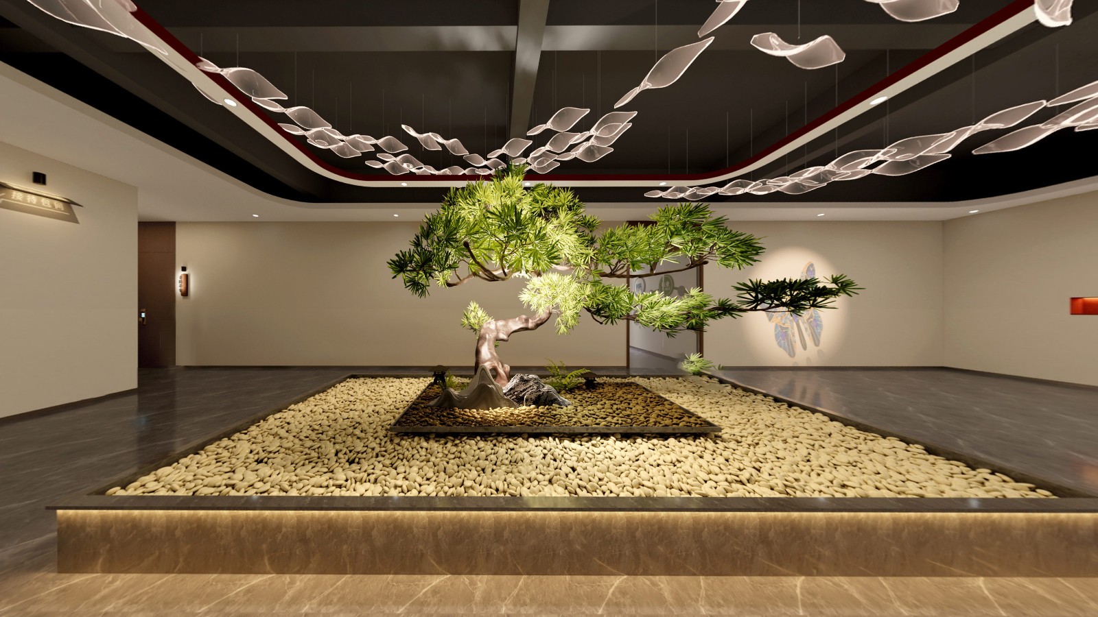 公共區(qū)域借鑒中國山水畫的意境,采用了假山、古樹、原石等造物裝飾,將山水美景移進(jìn)室內(nèi),營造出與自然和諧共生的氛圍.為進(jìn)入展廳做出了鋪墊。
