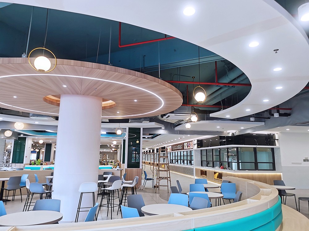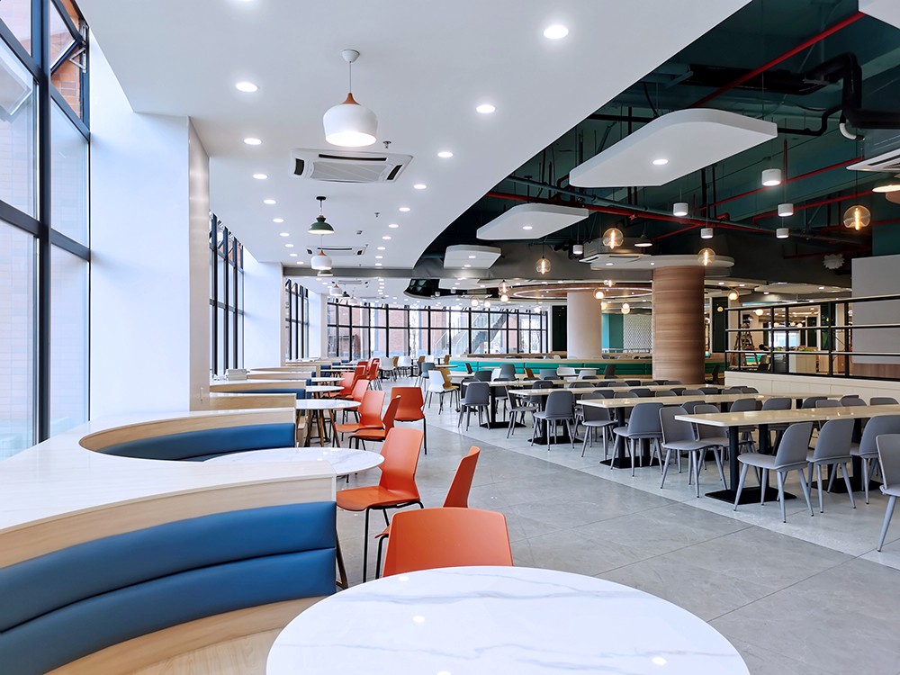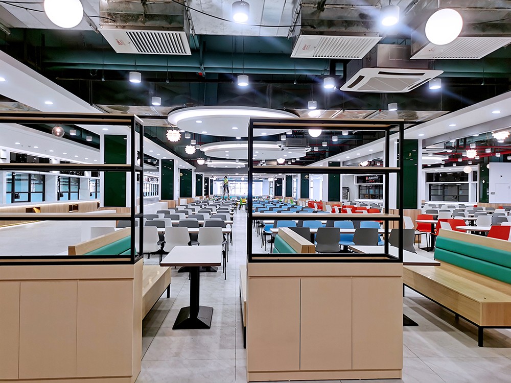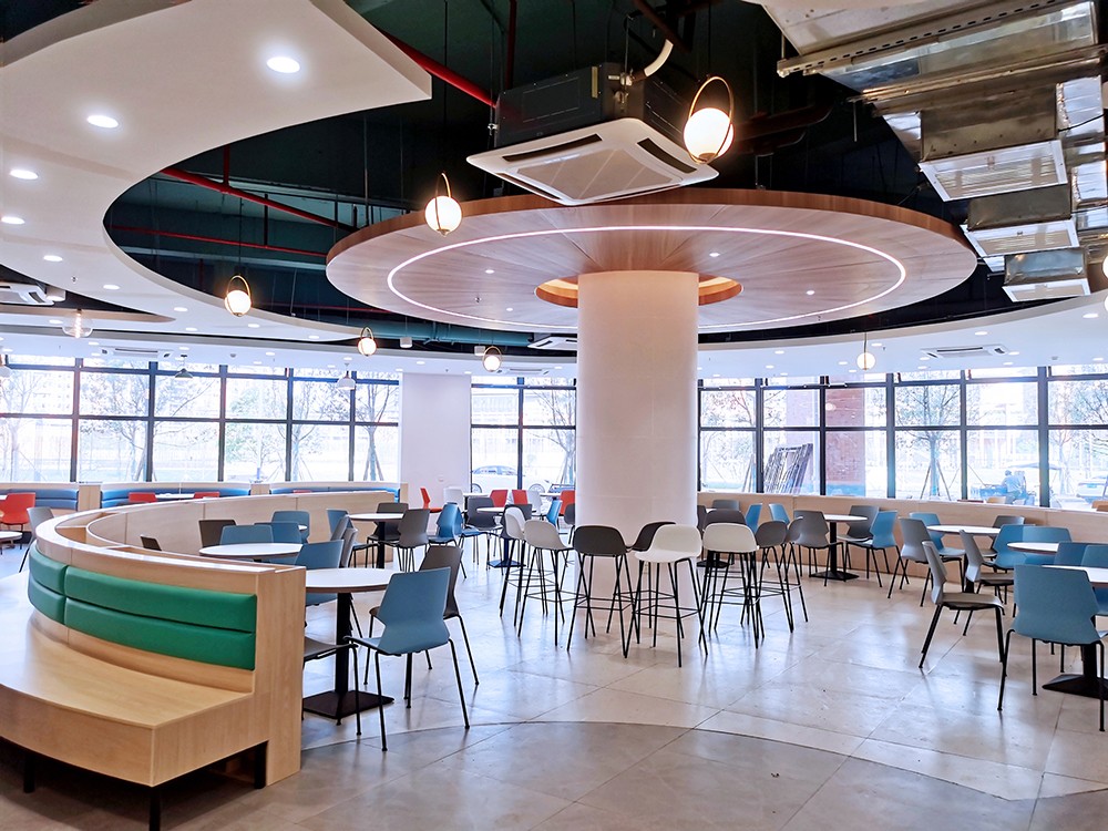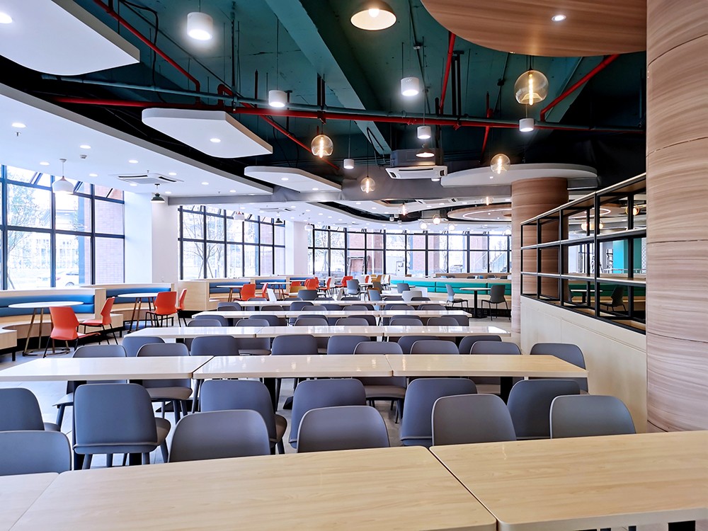 設計理念:空間設計力在突破傳統(tǒng)食堂形式,表達校園食堂快樂食間品牌意識,傳遞快樂食間價值觀。為學生和老師提供有品位的就餐環(huán)境,享受美食之外還具有學習、聚會、獨處的空間功能。整體空間在以白色為主基調(diào)的設計中,將天花裝飾藍色,柱子選用了一點墨綠色進行點綴,以注入環(huán)保、科技、自然等元素,呈現(xiàn)出美感與實用兼?zhèn)涞膭?chuàng)新設計。木質(zhì)桌椅溫潤自然,大盆綠植規(guī)律擺放,搭配錯落有致,整個空間自然開闊。