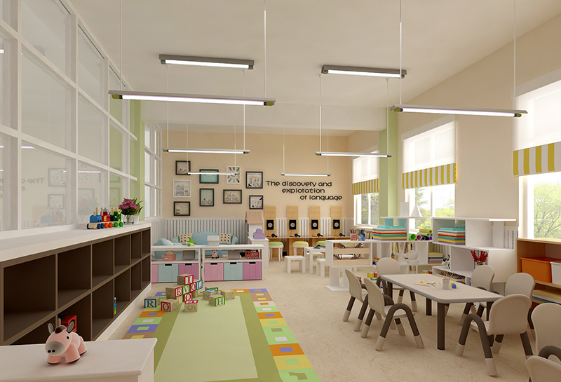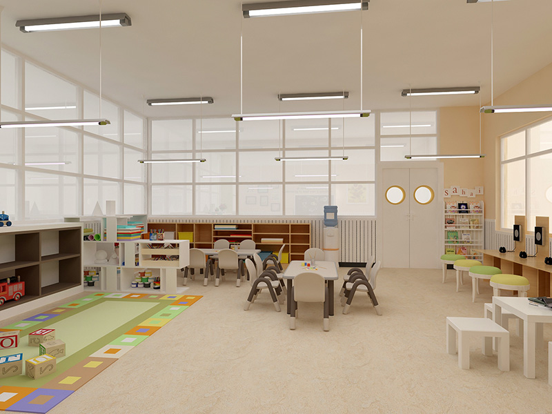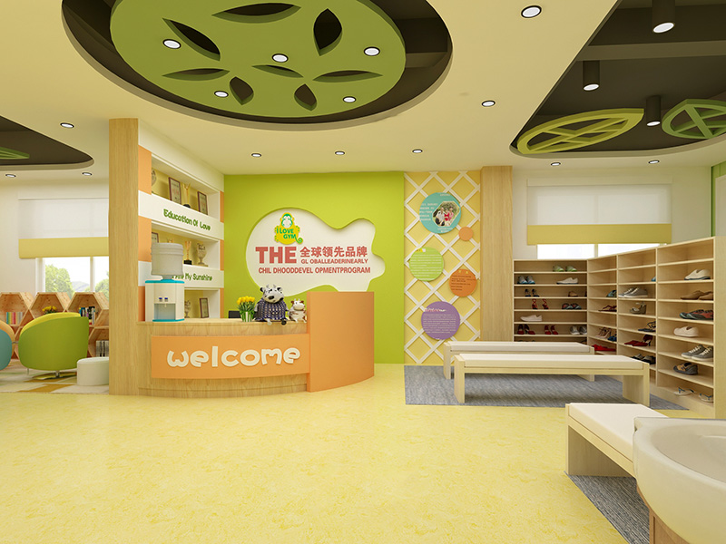 設(shè)計理念:本幼兒園設(shè)計案例基于兒童的心理及生理特點,設(shè)計師利用了顏色來表達情感。以淺橙色,蘋果綠作為主題色,分別代表了可愛柔和的親切感,活力明快的健康成長,清爽積極的探索思考。再加入了原木色的家具及柜體,使得整個空間在光線的映襯下顯得柔和,自然。大面積使用了原木墻板及原木假梁,這種秩序和結(jié)構(gòu)的關(guān)系對幼小的孩子充滿了啟發(fā)性。